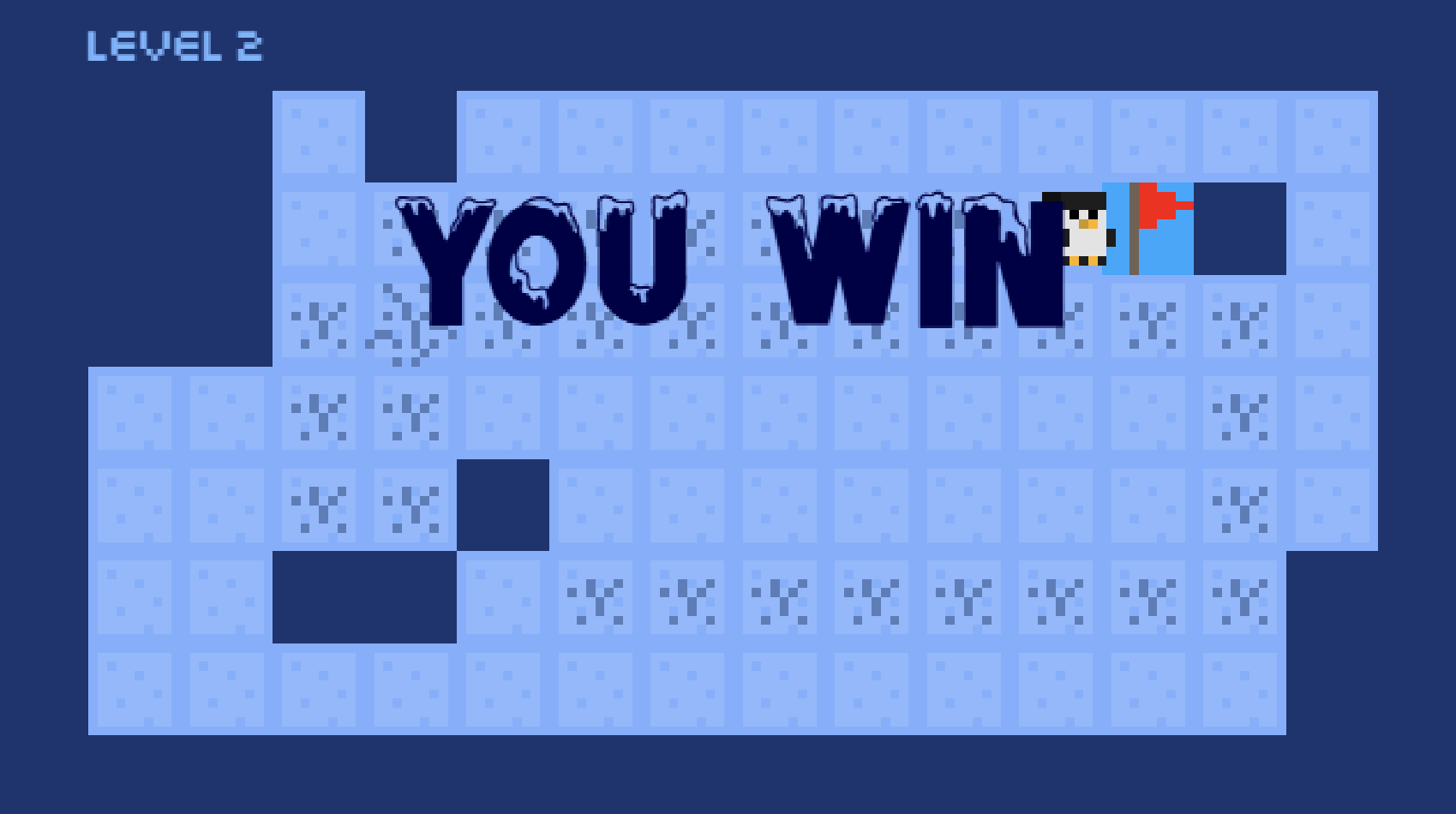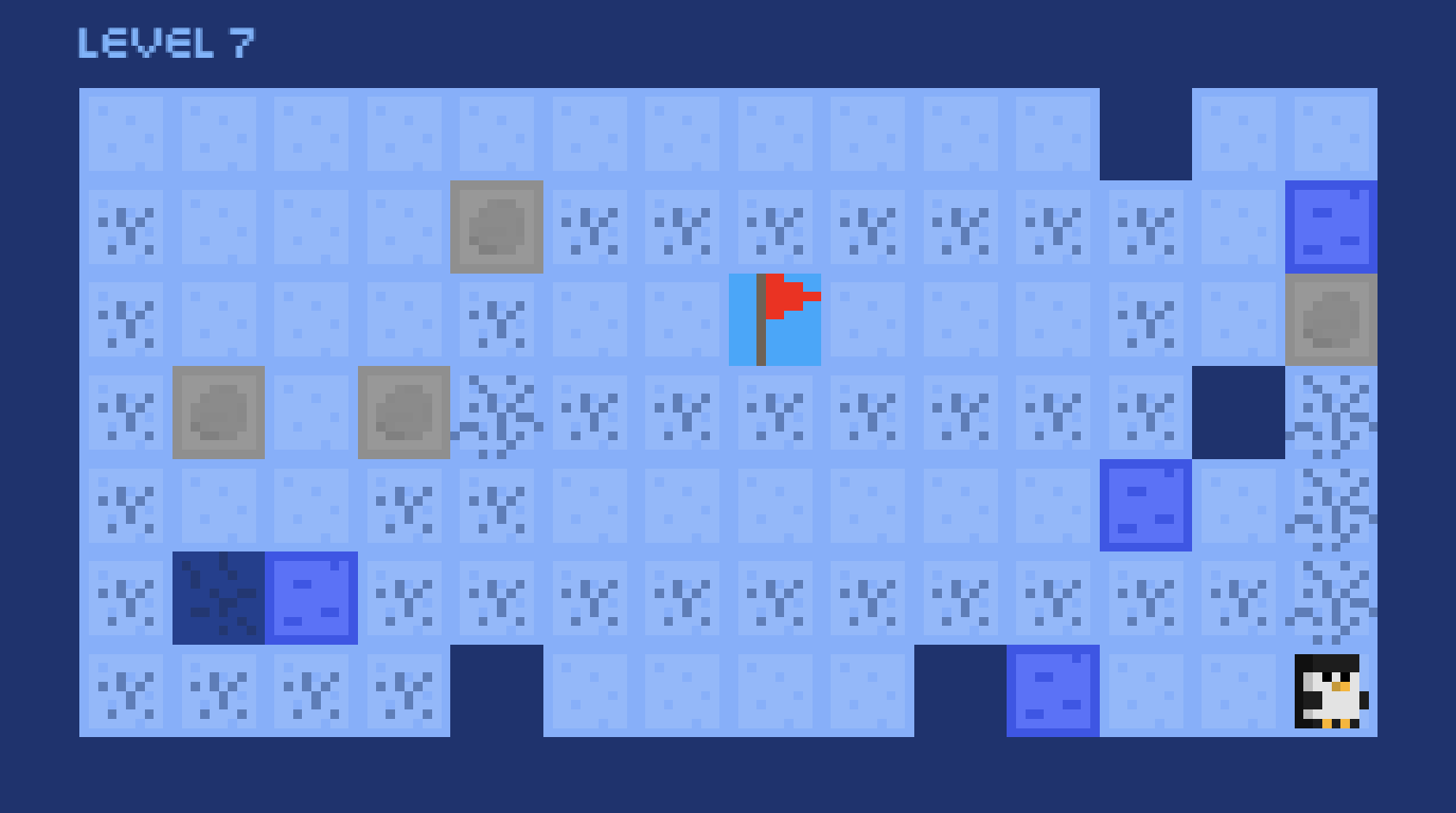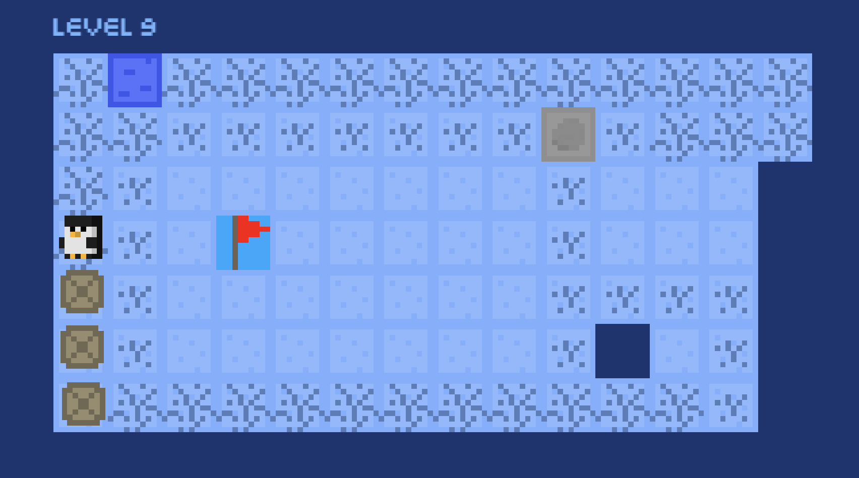 Play as a penguin, sliding around the circuit, trying to get to each flag. But, the ice is too slippery to walk on! You'll have to slide until you hit a wall or box! And watch out, as the ice is brittle and the water is deadly.